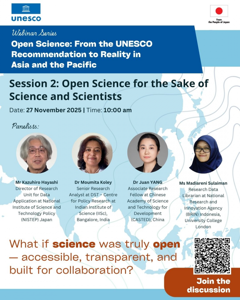 Organized by the UNESCO Jakarta Office under the theme "From the UNESCO Recommendation to Reality: Open Science in the Asia-Pacific Region," the webinar brought together researchers, policymakers, and experts from across the region to advance the implementation of the UNESCO Recommendation on Open Science (2021).
